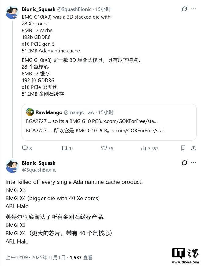 作为对比,目前已上市的旗舰型号ArcB580仅有20个Xe核心。这意味着被取消的顶级型号在核心规模上实现了翻倍,性能潜力巨大。